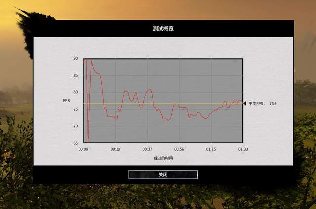 《全面战争:三国》是在1080P高画质下做测试的,平均帧数为76.9,最低帧也在65以上,非常给力。